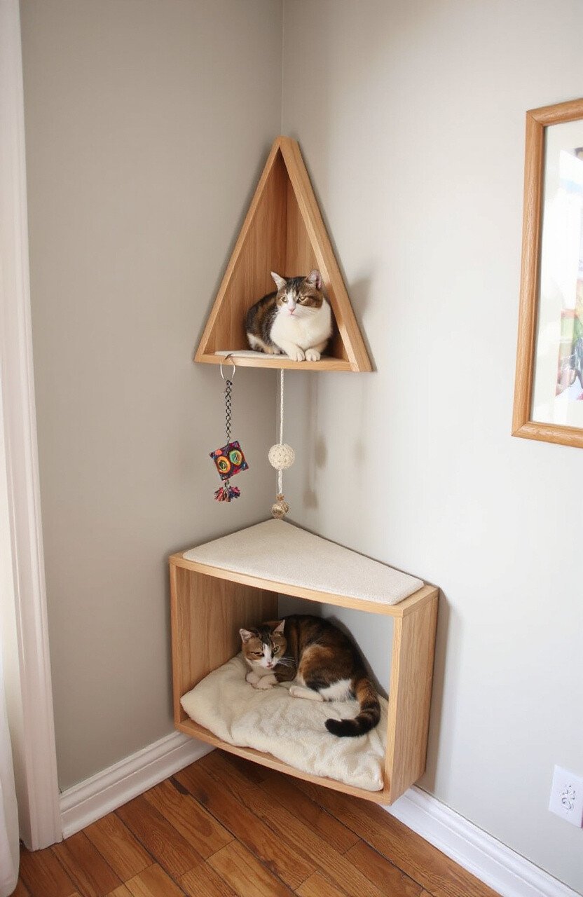 Cats love the security of a corner, and it’s a great way to maximize space. Add a soft, padded mat and some hanging toys for entertainment.