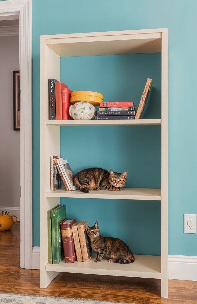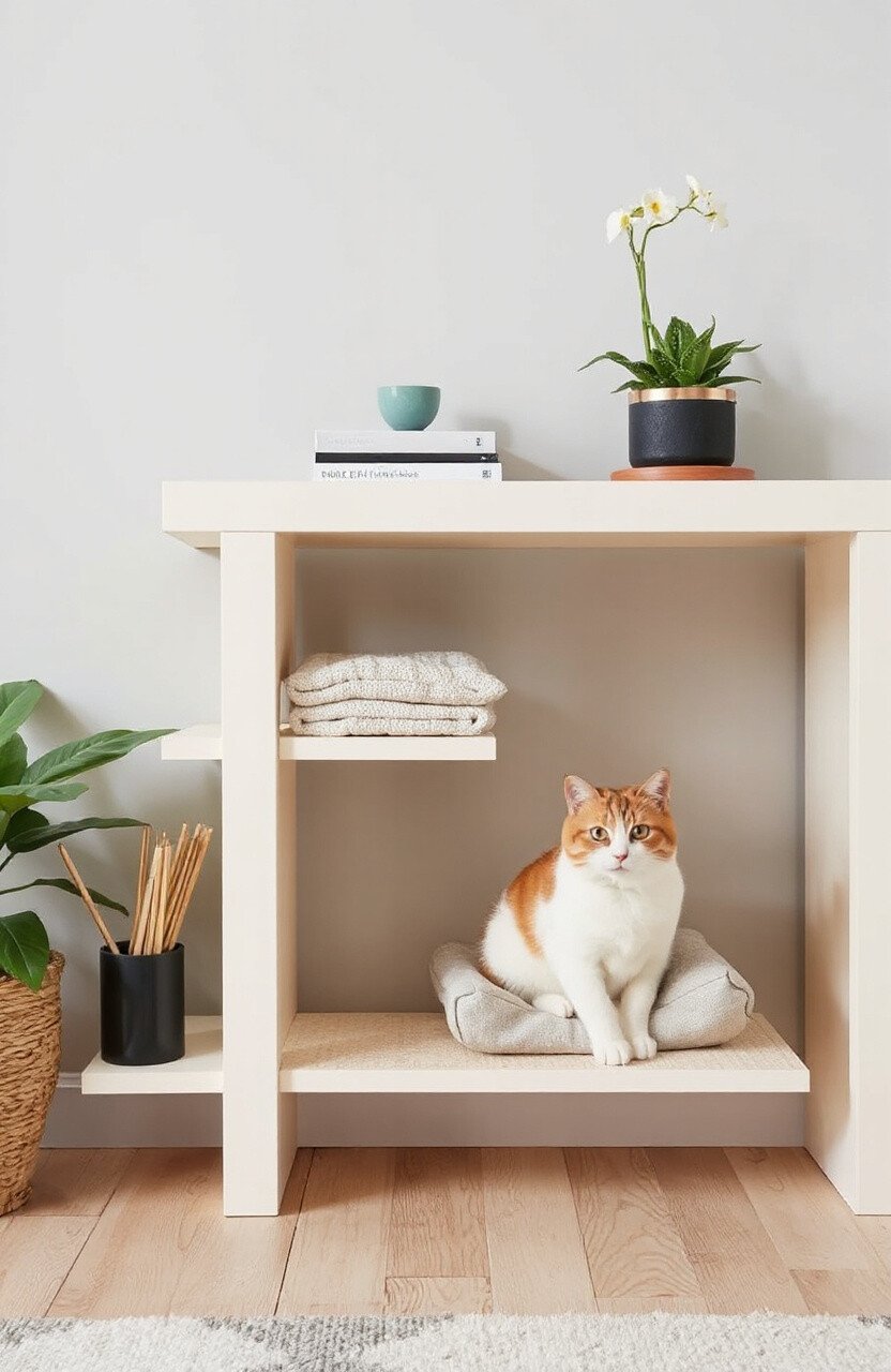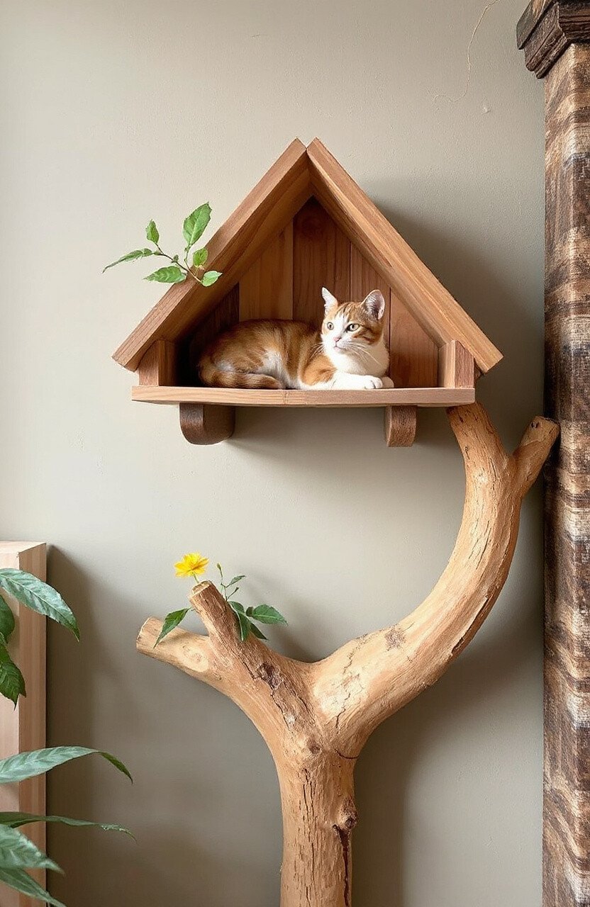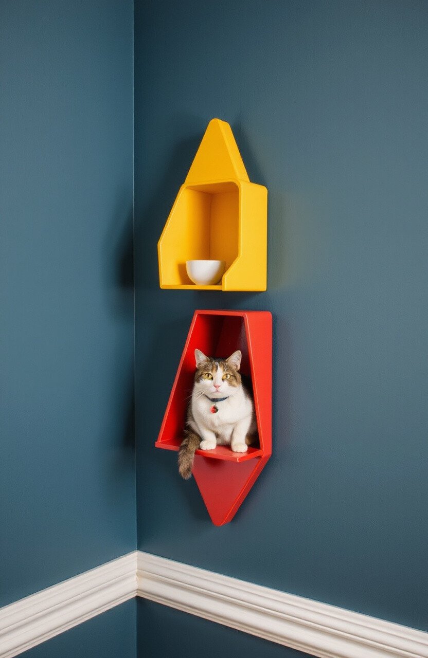 Make a statement with an artistic wall shelf that doubles as a cat perch. Think abstract shapes or bold colors.