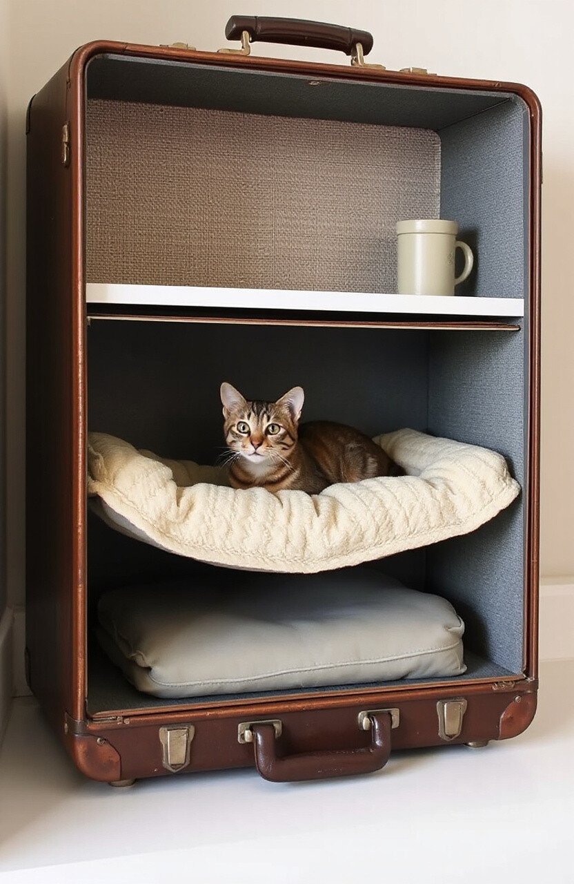 Repurpose an old suitcase into a quirky shelf. It’s a charming way to add vintage flair and a comfy hideaway.