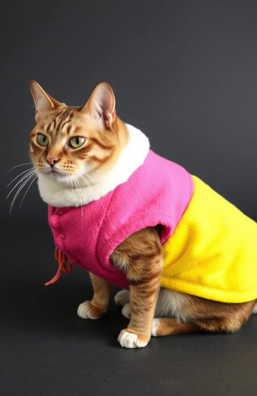 Use stretchy, breathable fabrics and add stripes for that athletic vibe. This jacket is perfect for energetic cats who love to play. It’s a practical choice that doesn’t skimp on style.