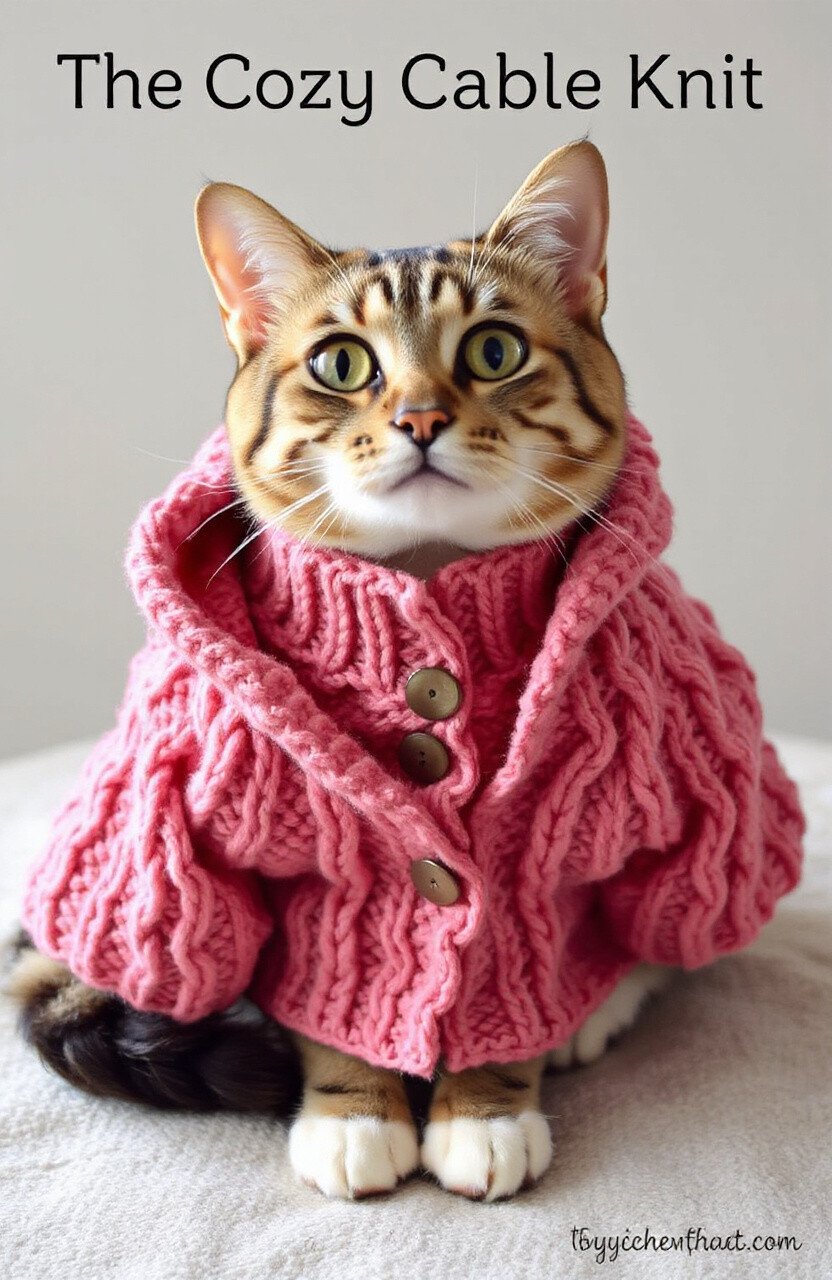 Imagine your cat wrapped in a soft, cozy cable knit jacket. Perfect for cooler days, this jacket not only keeps your cat warm but adds a touch of classic elegance. If you love knitting, this is a great project to personalize with different yarn colors.
