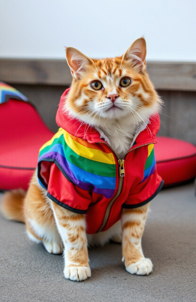 Celebrate diversity with a rainbow pride jacket. The vibrant colors make a bold statement, showing support for inclusivity. It’s a joyful addition to any cat’s wardrobe.