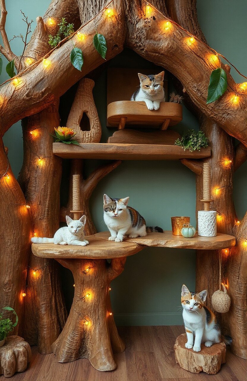 Create a magical world with tree trunk shelves and fairy lights. Your cat can become the protagonist of their very own fairytale.