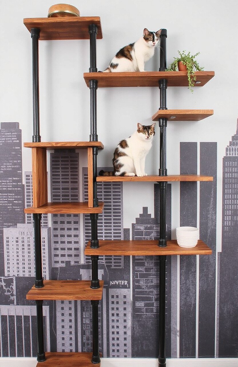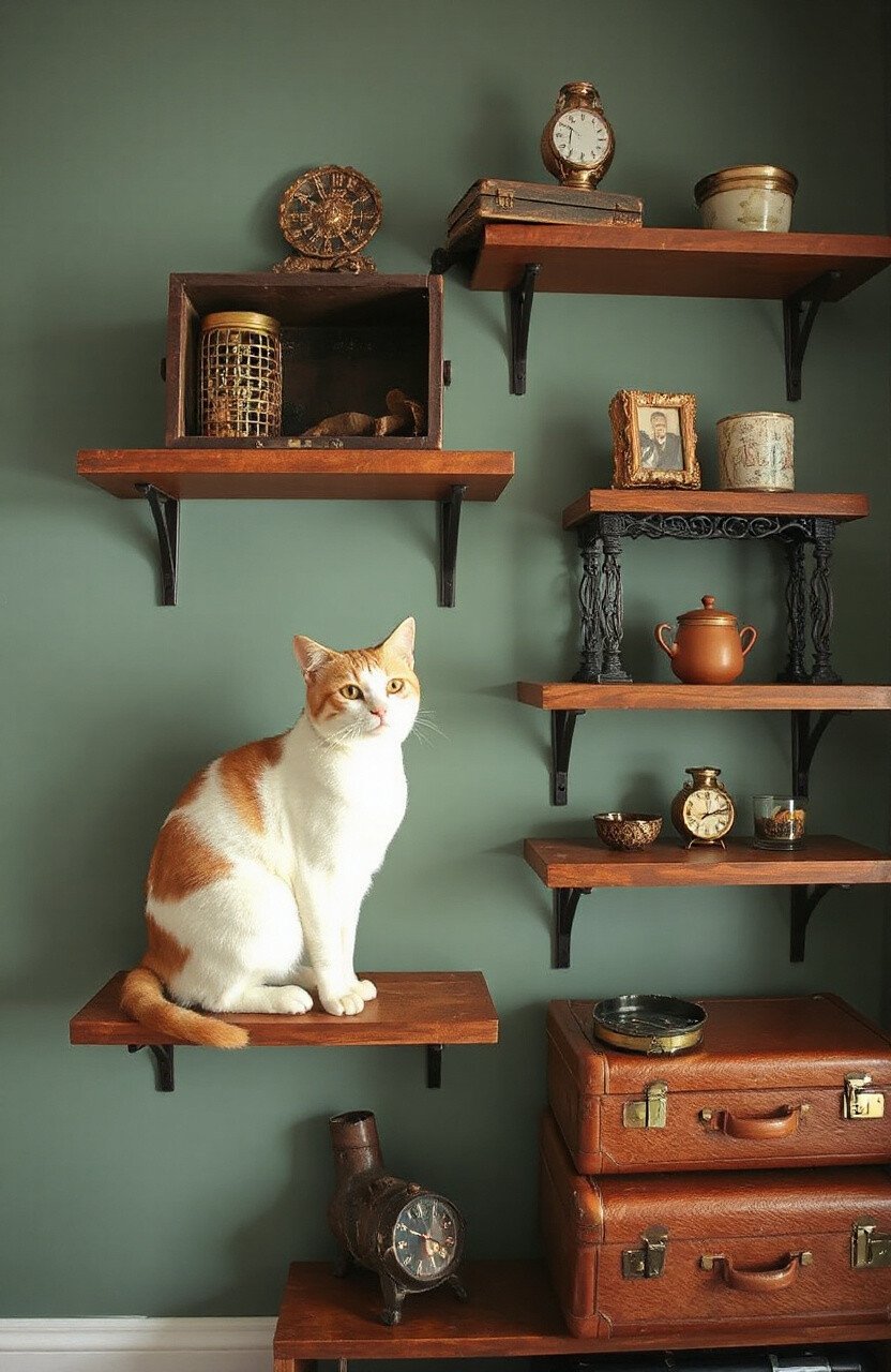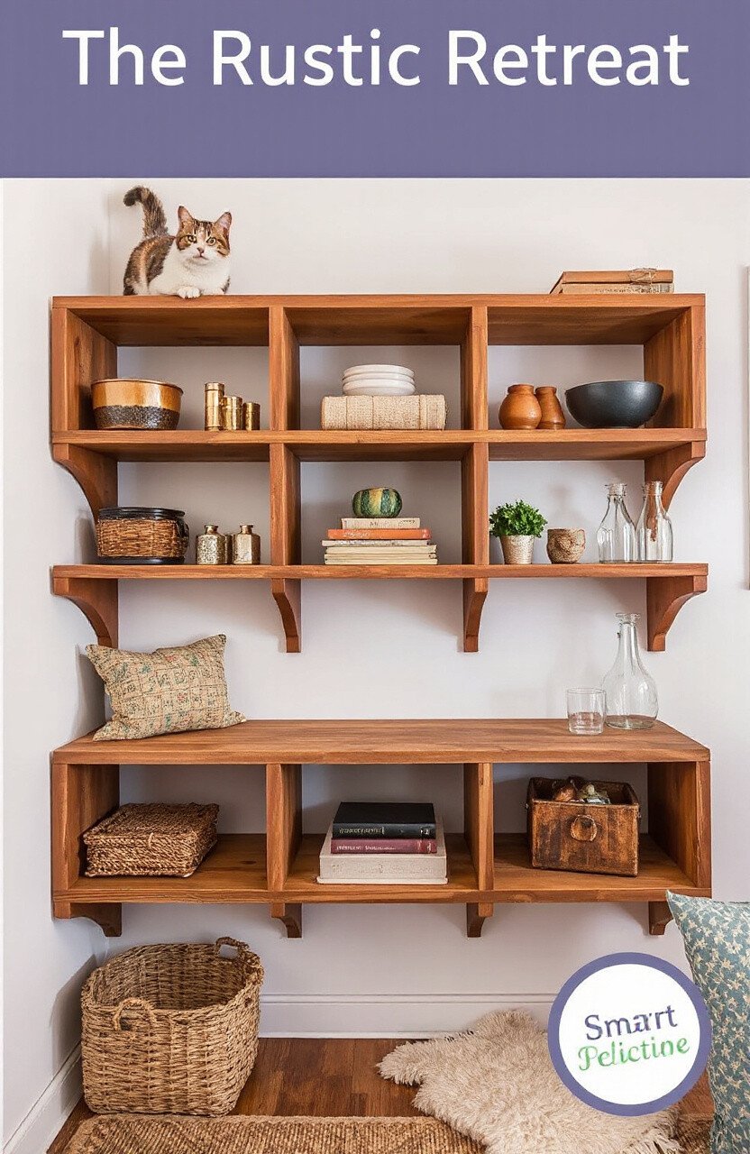 Bring the charm of the countryside indoors with rustic wooden shelves. Your cat will enjoy the natural textures and cozy nooks.