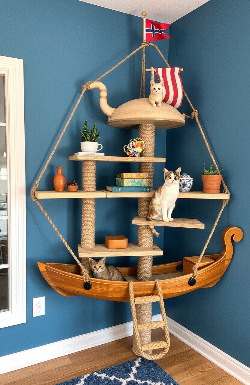 Transform your space into a seaside escape with rope bridges and boat-shaped shelves. Your cat can become the captain of their own ship!