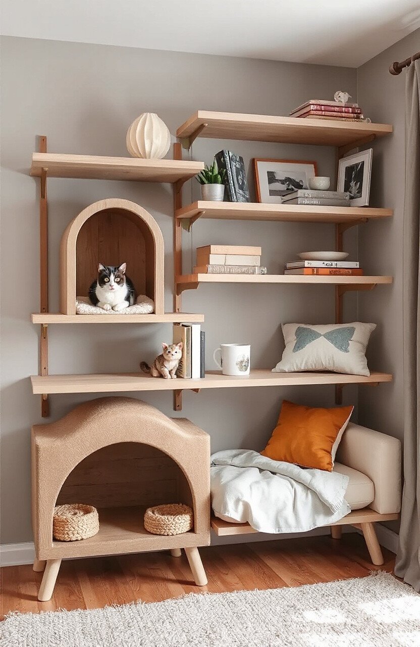 Turn your cat’s playground into a work of art with shelves that double as wall art. Think bold colors, abstract shapes, and dynamic patterns.