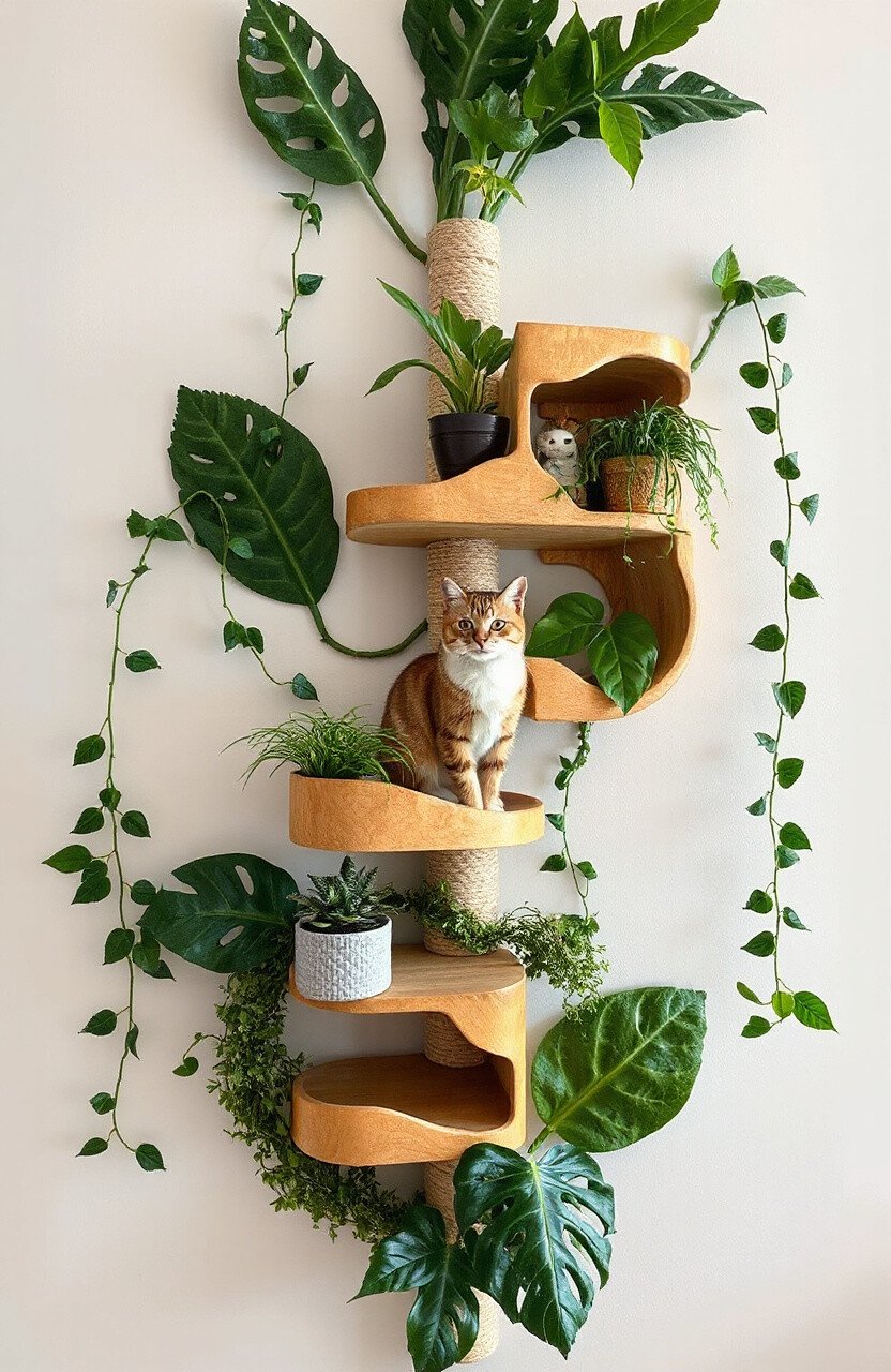 Create a lush, jungle-themed environment with leaf-shaped shelves and faux vines. Your cat will feel like a wild explorer navigating through the treetops.