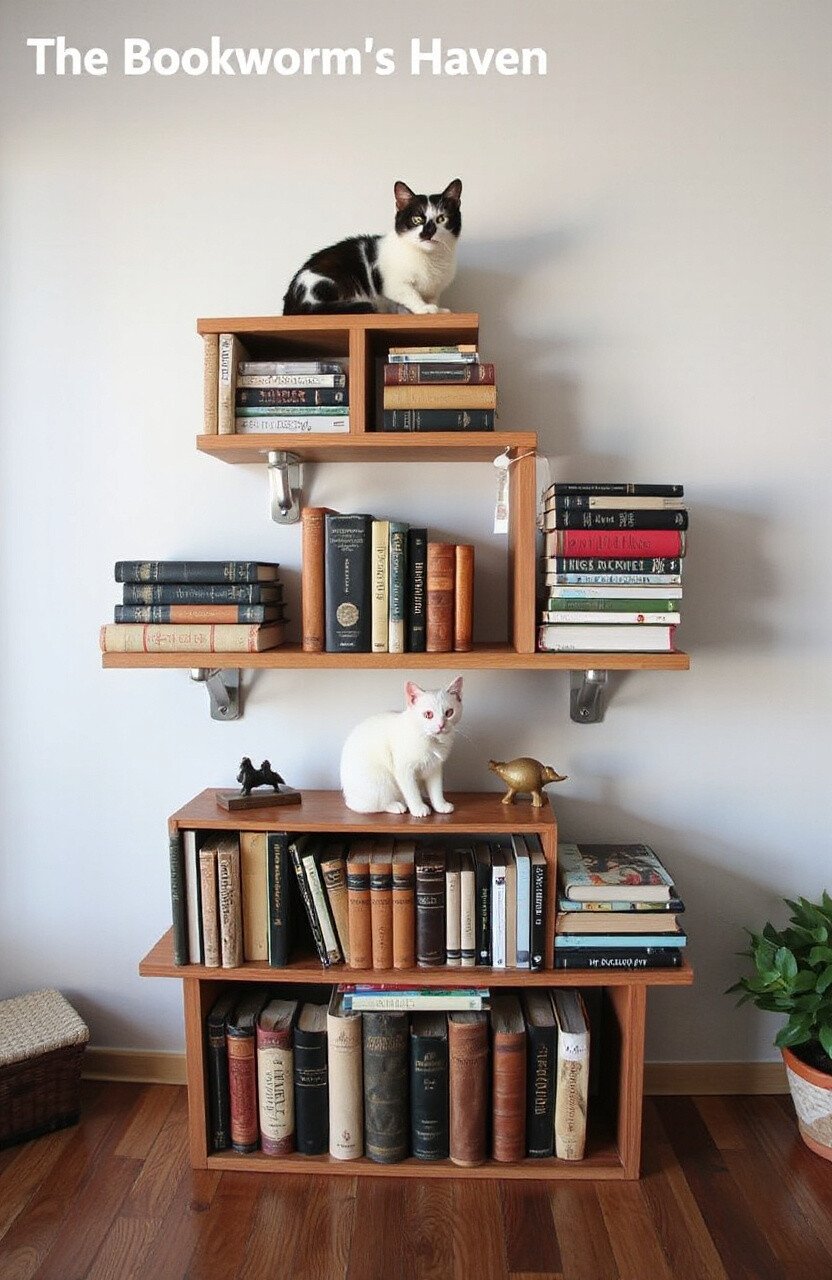 Combine your love for books and cats by creating a library-themed shelf system. Stack books horizontally to form sturdy ledges for your feline friend.