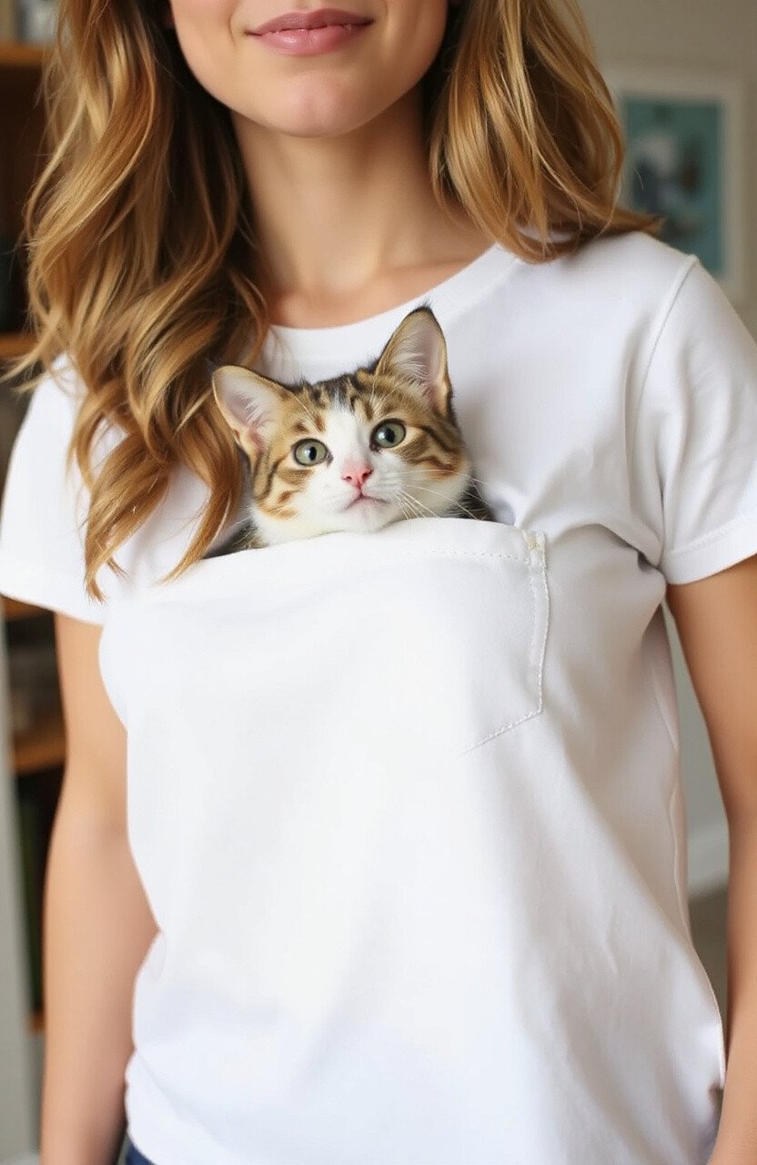 This tee features an adorable cat peeking out of a pocket. The pocket design adds a fun twist, giving the illusion that your little furry friend is always with you. It’s perfect for casual outings or lounging at home.