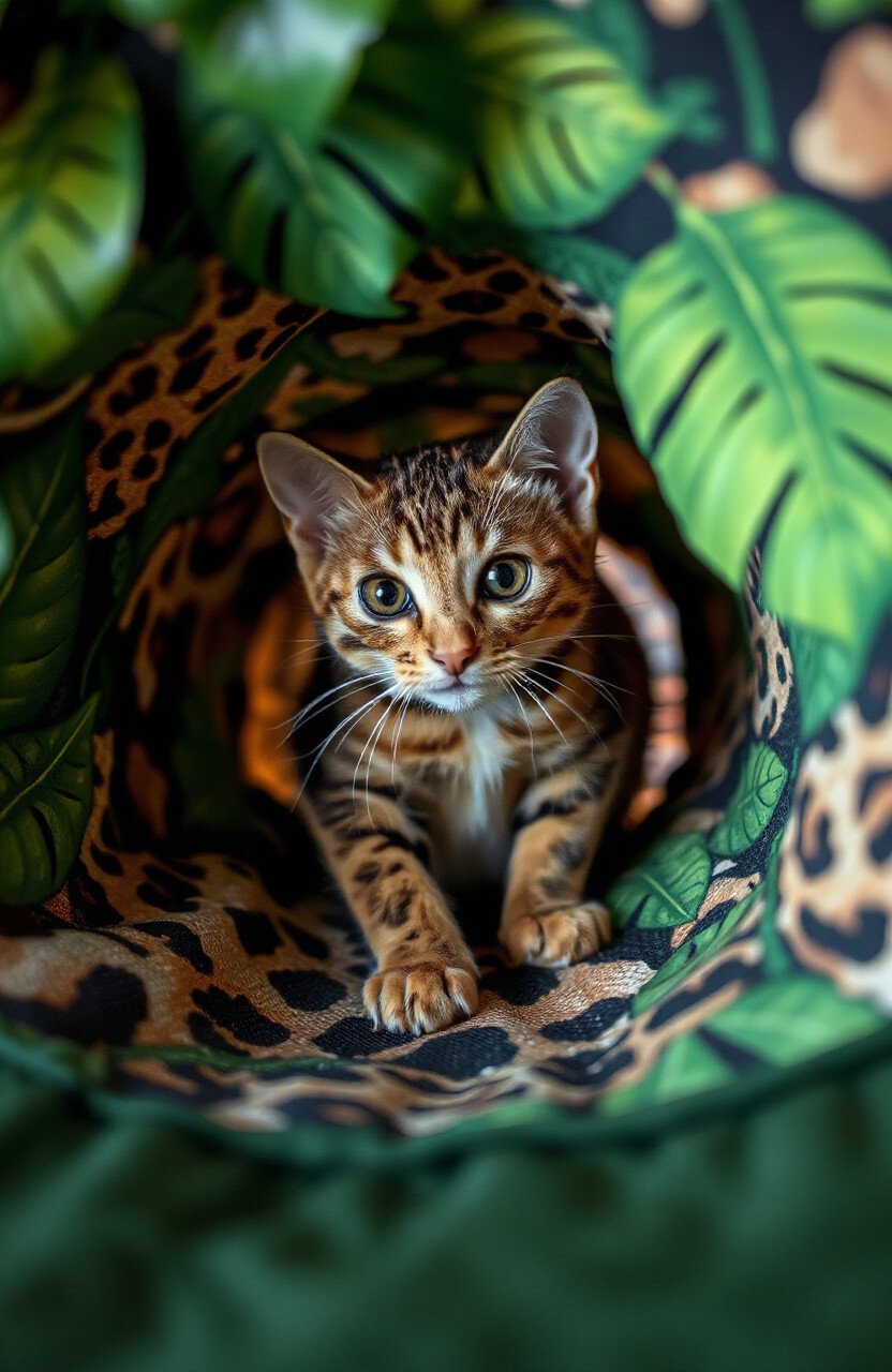 Embark on a wild journey with a jungle-themed tunnel. Adorned with animal prints and jungle greens, this tunnel becomes a safari for your cat. It’s an exciting escape into the wild.