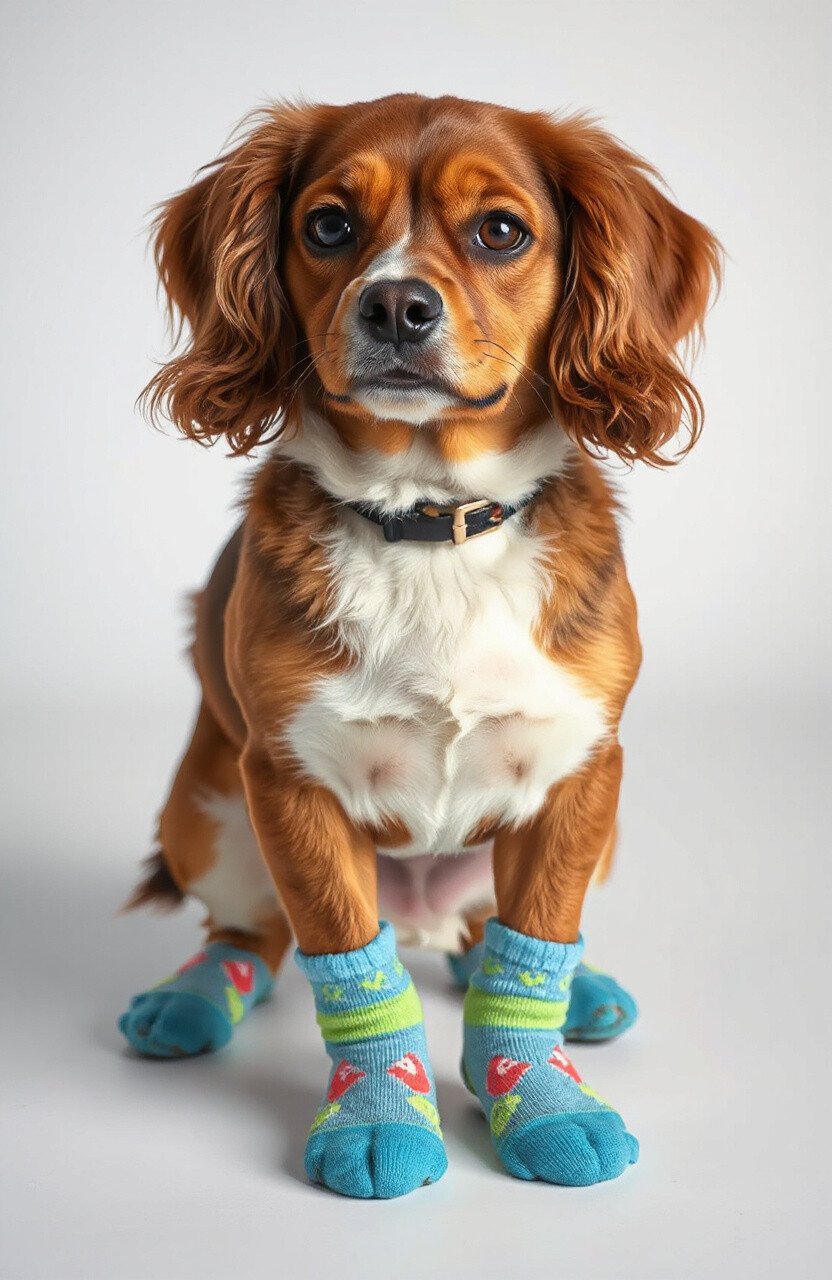 Socks aren’t just cute; they can protect your pup’s paws from the cold. Choose bright, funky patterns for extra style points.