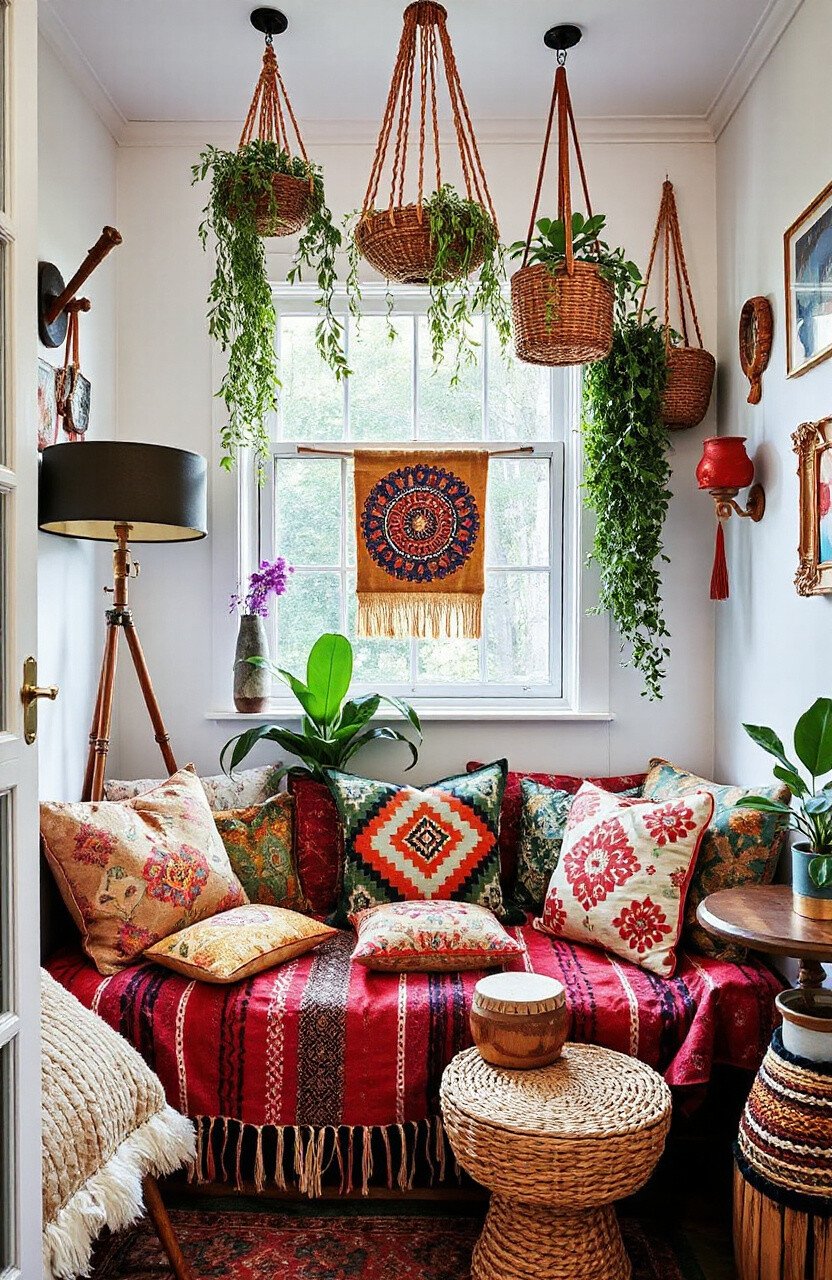 A boho-style nook with colorful textiles, pillows, and hanging plants creates a relaxed and free-spirited vibe.