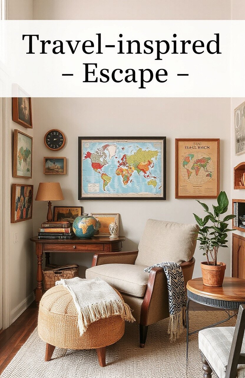 A travel-themed nook with maps, souvenirs, and a comfy chair can transport you to far-off places.