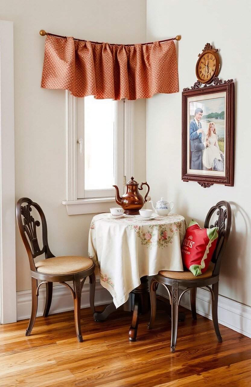 Create a vintage tea nook with a small table, two chairs, and a pretty tablecloth. Add a teapot and cups for an authentic touch.