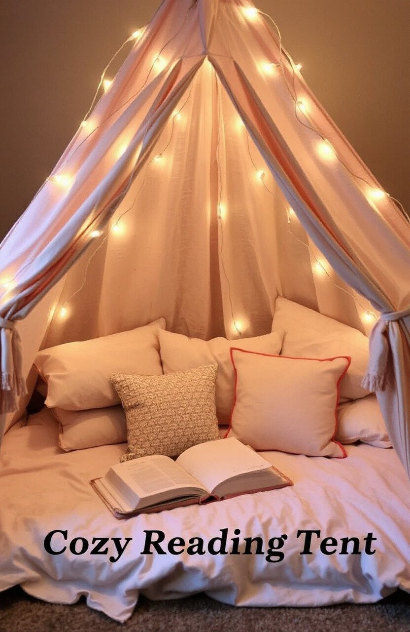 Imagine a small tent filled with pillows and fairy lights. It’s a magical reading nook that feels like a cozy hideaway.