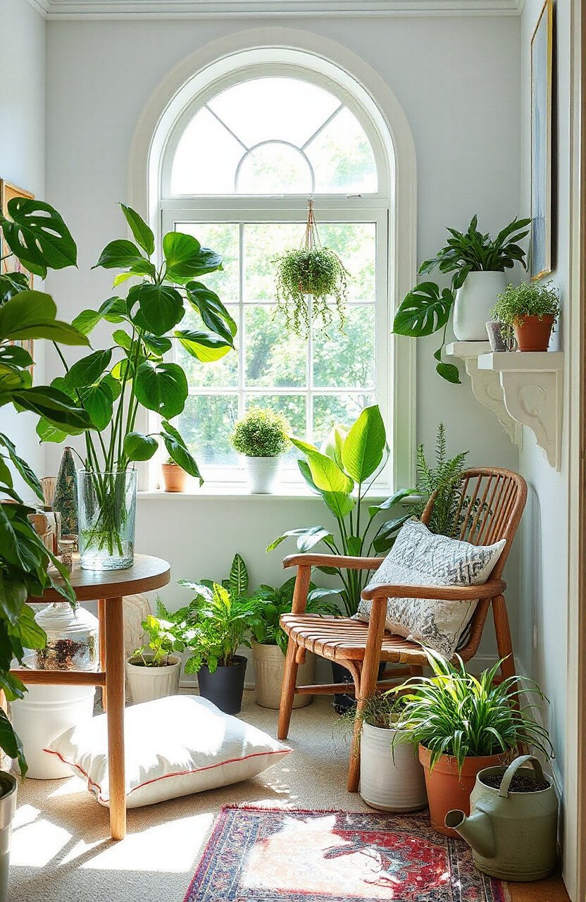 Transform a sunny corner into a mini indoor garden with potted plants, a comfy chair, and a watering can nearby.