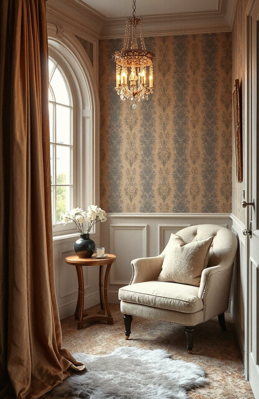 Create a glam nook with luxurious textiles, a plush chair, and a small chandelier. It’s a space of elegance and sophistication.