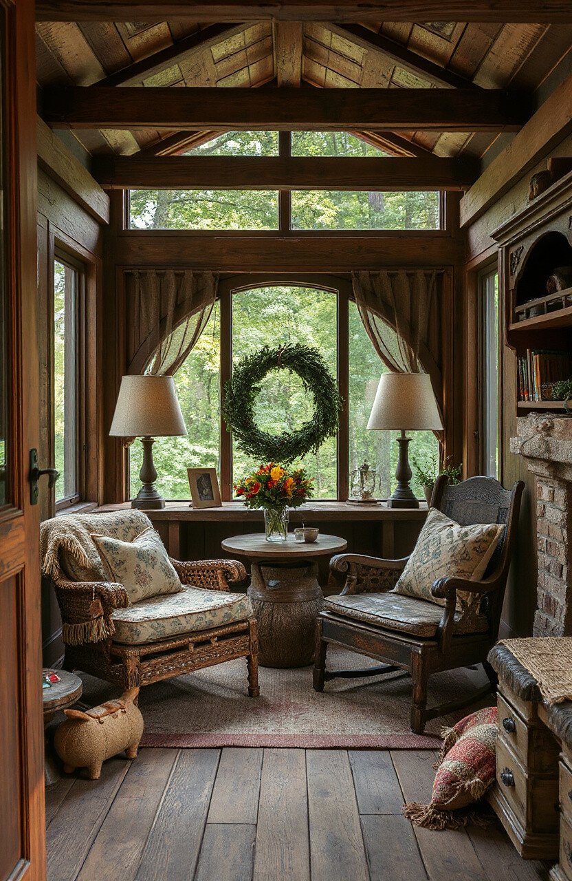A rustic nook with wooden furniture, burlap textiles, and nature-inspired decor can feel like a cozy cabin in the woods.