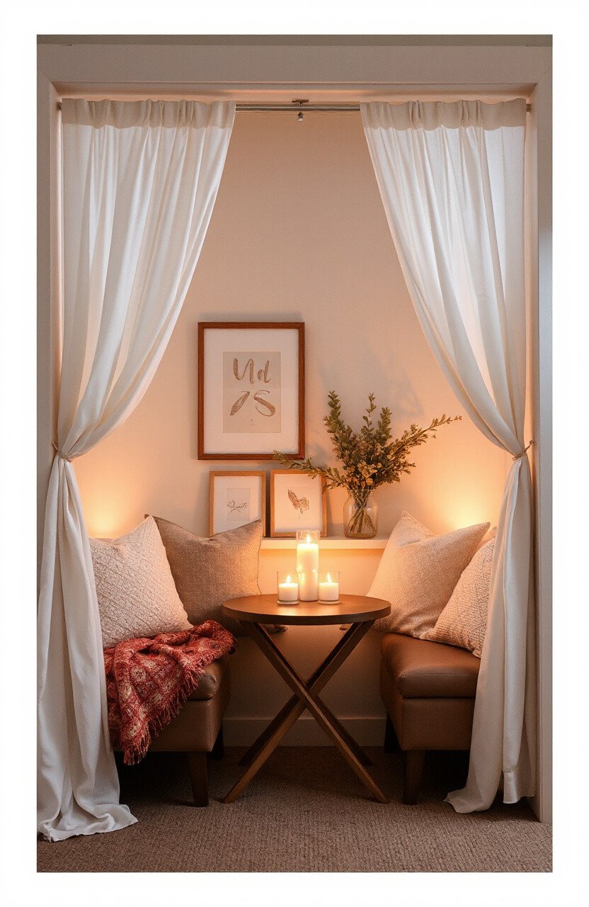 Create a romantic nook with soft lighting, plush textiles, and a small table for two. It’s a space for intimate moments and relaxation.
