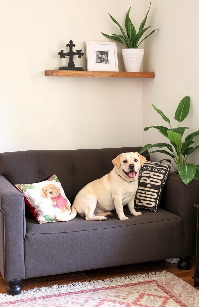 Install a corner shelf above your dog’s couch to display plants, books, or dog treats. It’s a great way to utilize space and add decor.