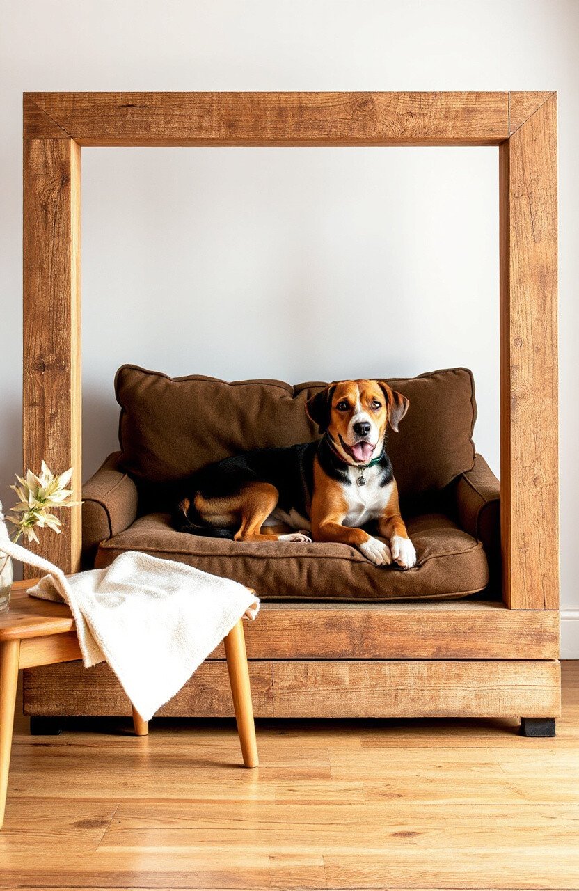 Frame your dog’s couch with reclaimed wood for a rustic, farmhouse look. This idea is perfect for homes with a natural, earthy vibe.