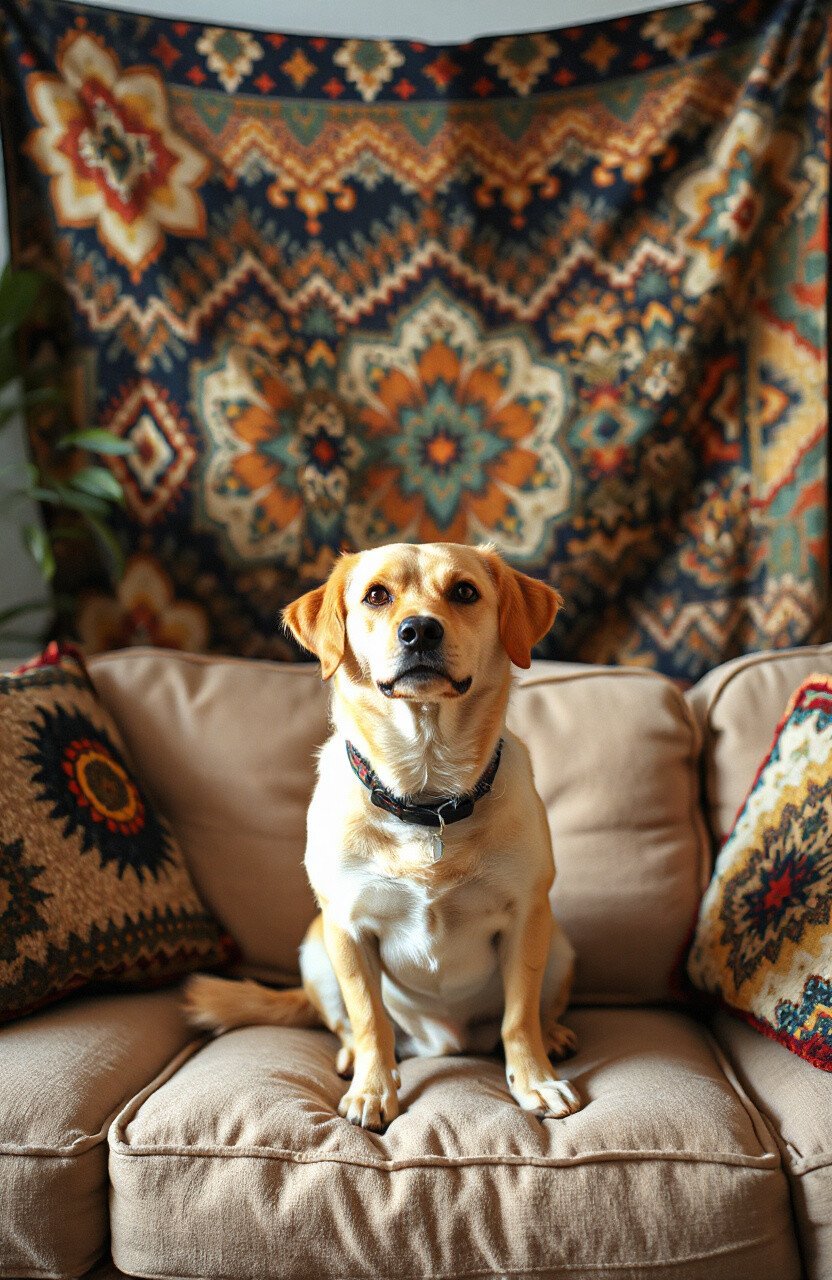 Add a bohemian tapestry behind your dog’s couch for a splash of color and pattern. It’s a bold statement that adds personality to the space.