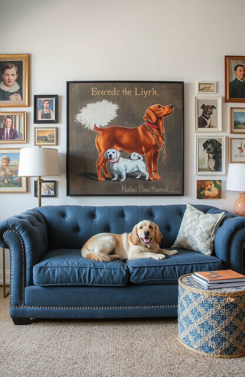 Enhance your dog’s couch area with an artistic backdrop. This could be a mural, a gallery wall, or a large piece of art.