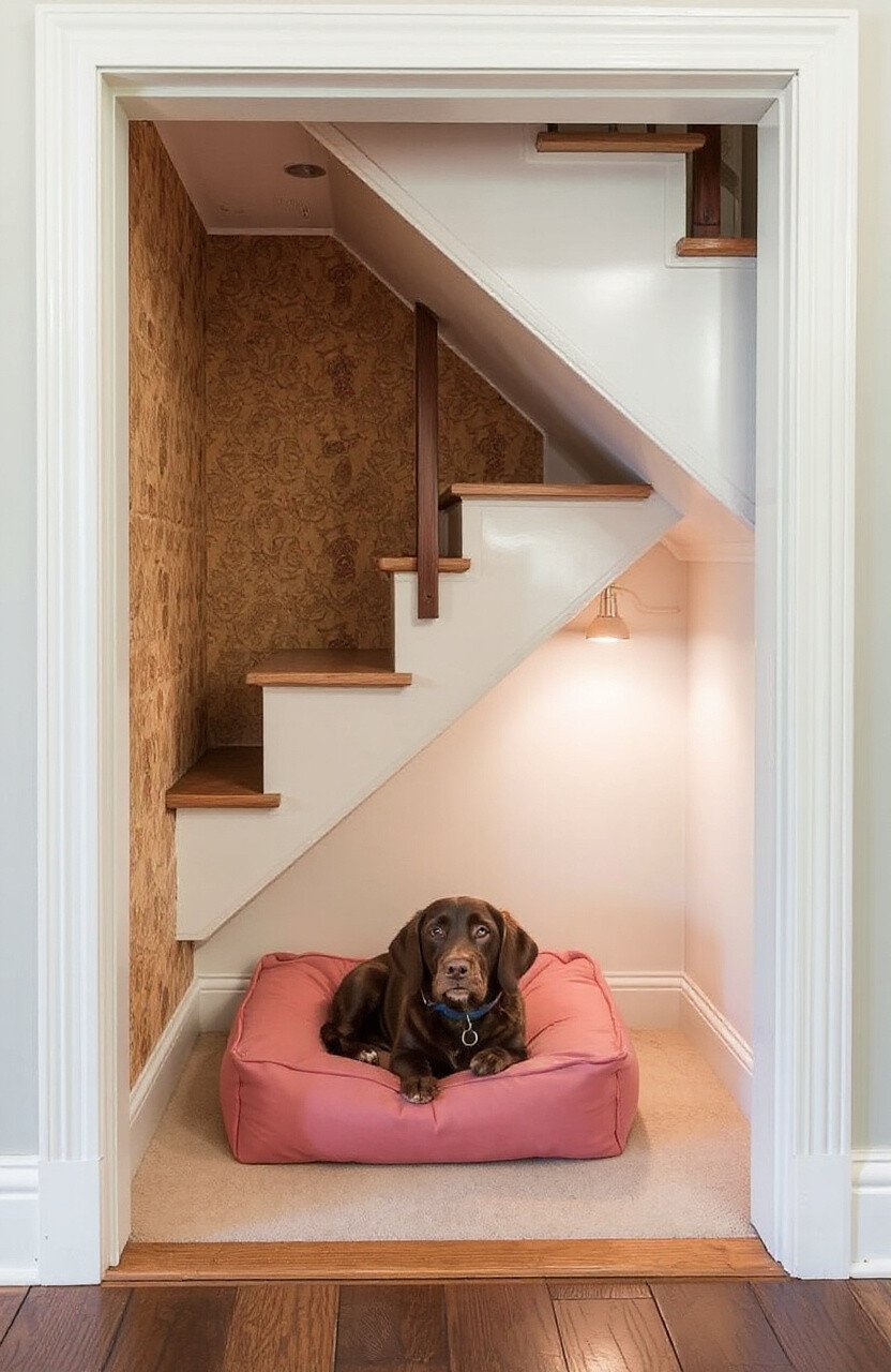 Transform the space under your stairs into a secret doggy den. It’s an often overlooked area that can be turned into a snug retreat. Add a cushy bed, some soft lighting, and voilà!