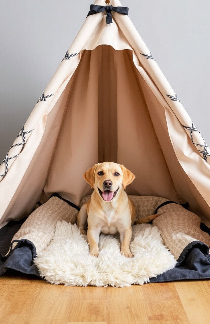 Give your dog a playful hideout with a teepee. It’s a trendy choice that provides a comfy and stylish space for your pet to relax. Whether in your living room or backyard, it’s sure to be a hit!
