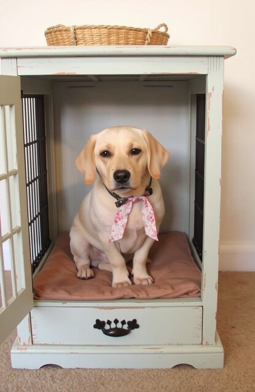 This idea is perfect for dogs who love a bit of elegance. The crate provides a secure space, while the shabby chic style adds a feminine touch. Decorate with lace or floral patterns for added flair.