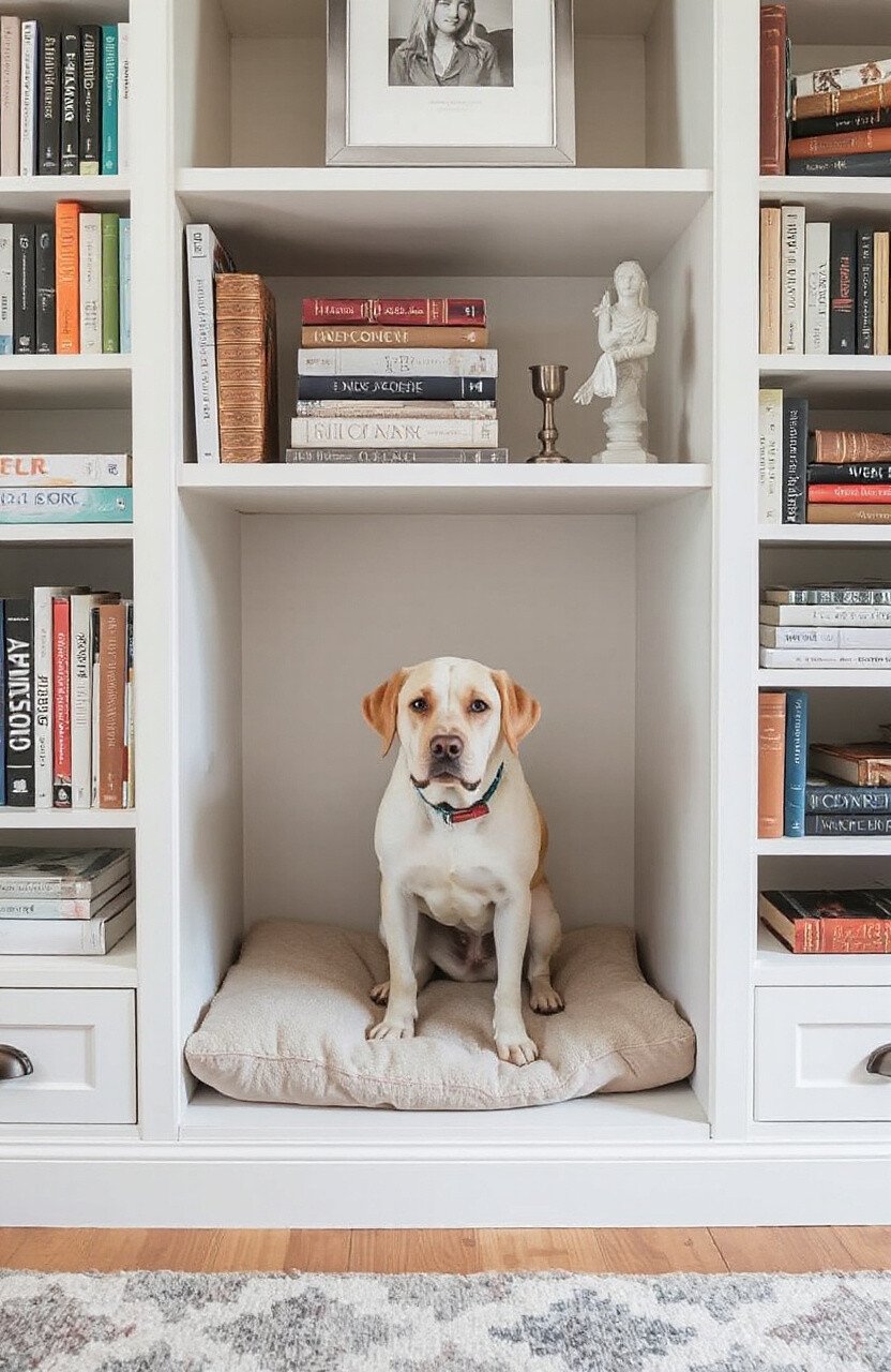 This idea is perfect for book lovers who want to keep their dog nearby. The enclosed space of the bookcase offers a cozy retreat, and you can decorate it with some of your dog’s favorite items.