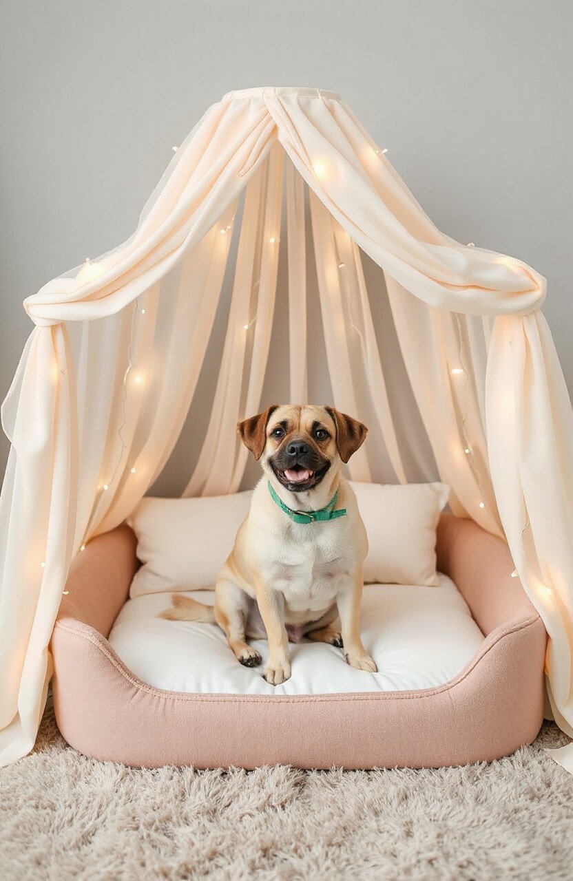 This idea suits dogs who love to feel pampered. Use light, airy fabrics for the canopy to ensure it doesn’t feel too heavy or confining. Add fairy lights for a magical touch that enhances the ambiance.