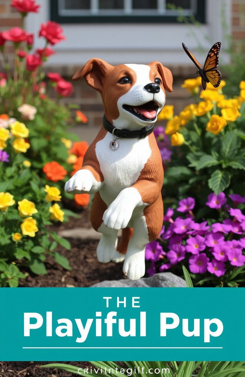 The Playful Pup statue captures the essence of a dog caught mid-leap, chasing after a butterfly. This joyful piece brings a sense of movement and life to your garden.