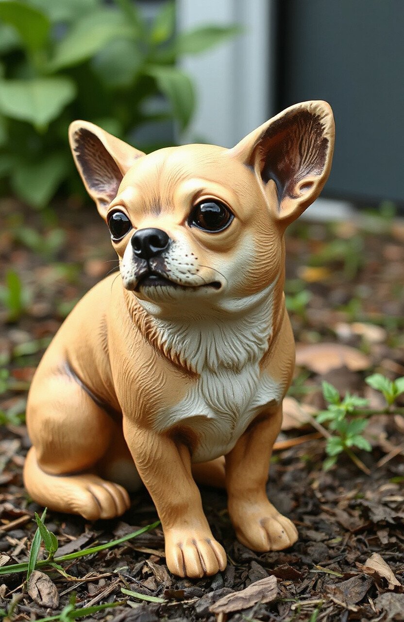 The Curious Chihuahua captures the inquisitive nature of this tiny breed. Its alert pose adds a playful touch to your garden.