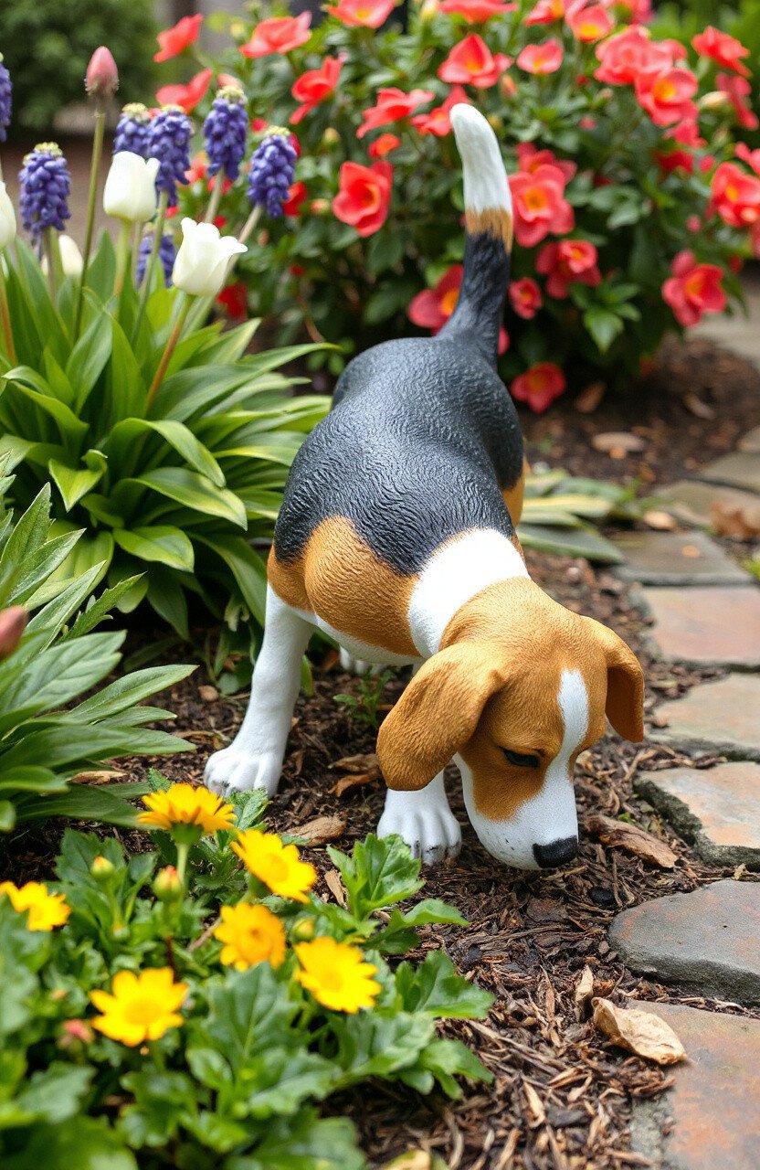 The Garden Beagle captures the curious nature of a beagle sniffing the ground. It adds a lively touch to your garden.