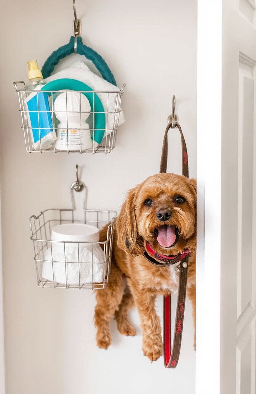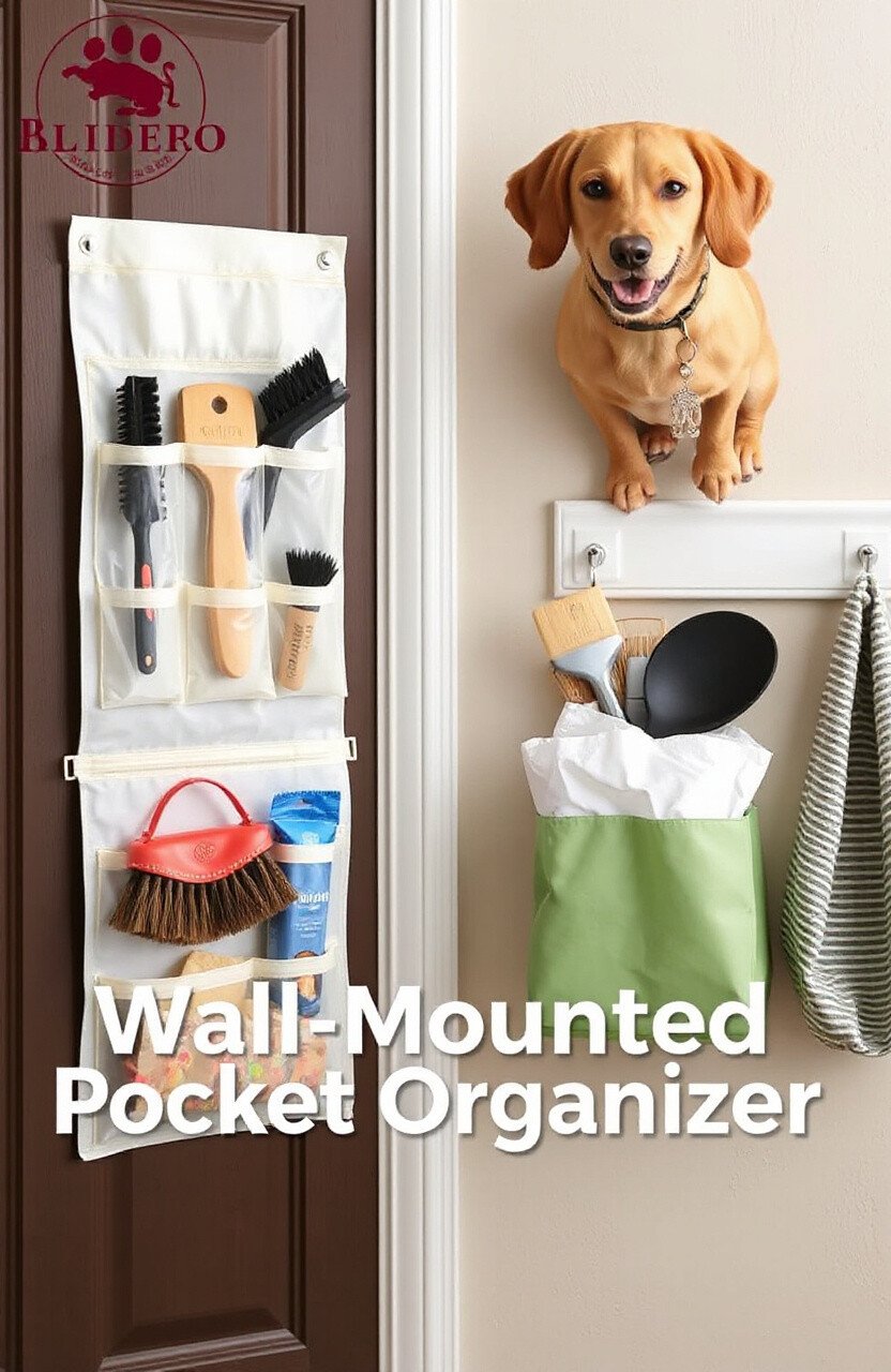 Use a wall-mounted pocket organizer for small items like brushes and waste bags. It’s great for tight spaces.