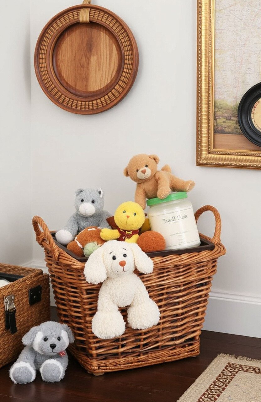 A wicker basket is not just for laundry. It’s perfect for storing your pup’s favorite plush toys.