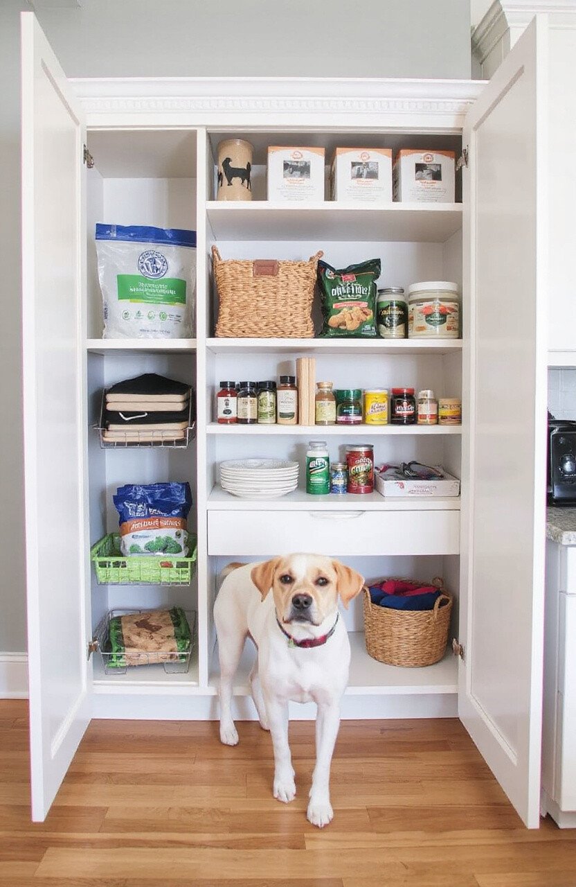 Transform an old bookshelf into a pet storage unit. It’s a practical and stylish solution.