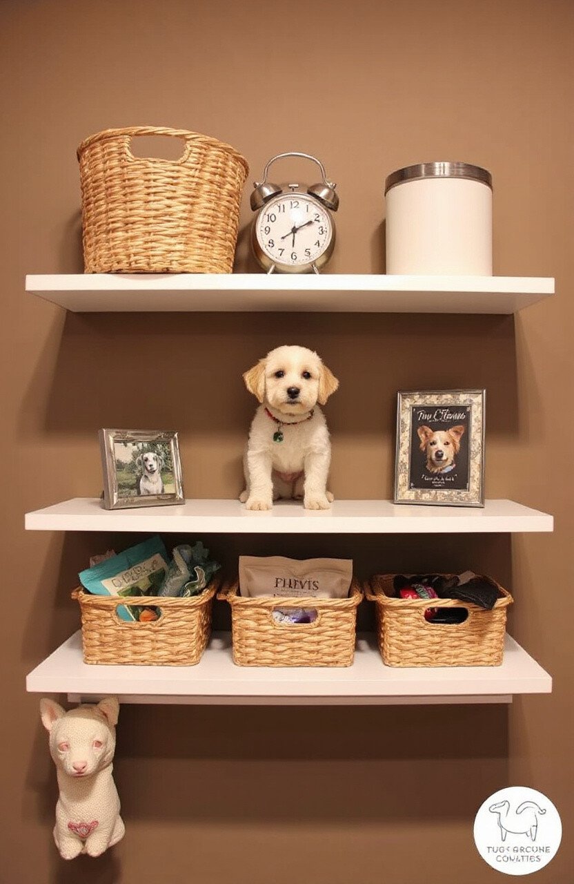 Floating shelves are perfect for displaying dog accessories. Add small baskets for a clean look.
