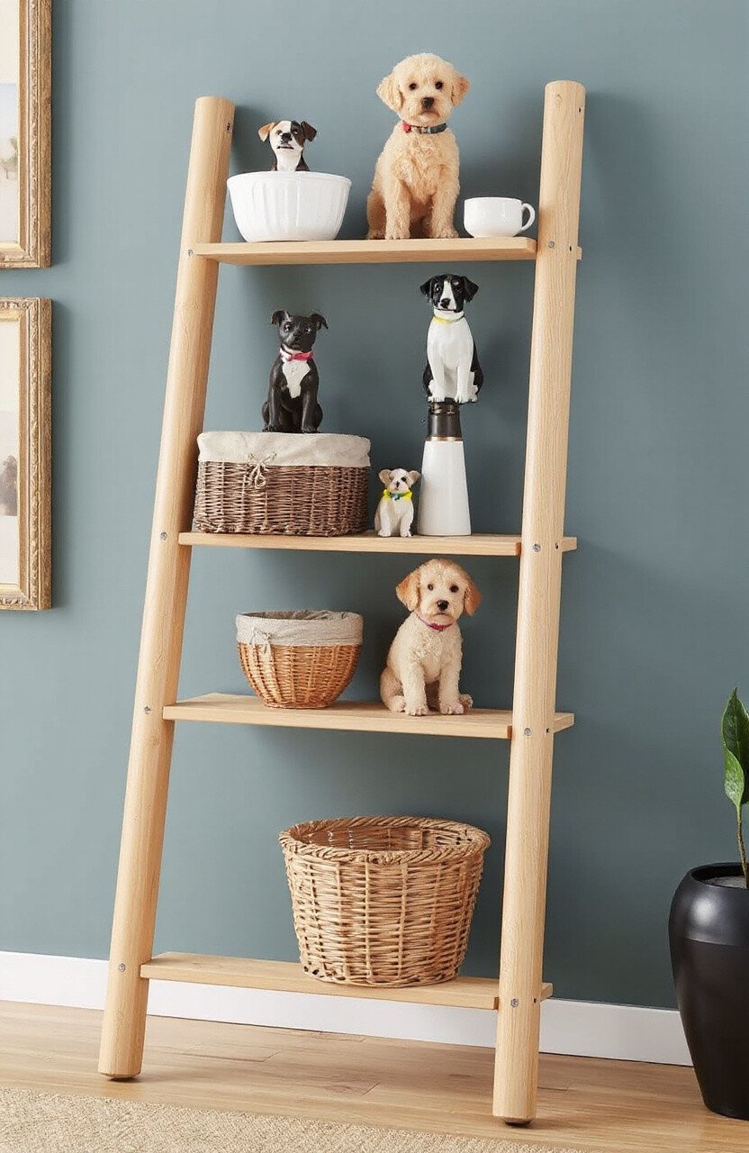 A ladder shelf brings a modern touch to storage. Use it to hold baskets or display cute dog decor.