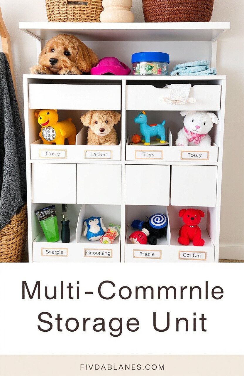 A storage unit with multiple compartments is ideal for organizing various dog supplies.