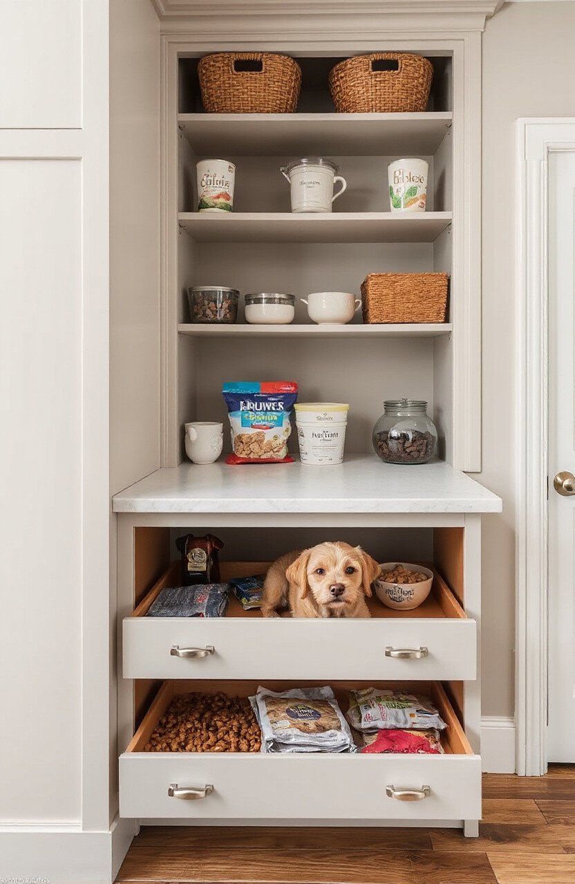 For a sleek look, consider built-in drawers in your kitchen or mudroom. They’re perfect for dog food and treats.