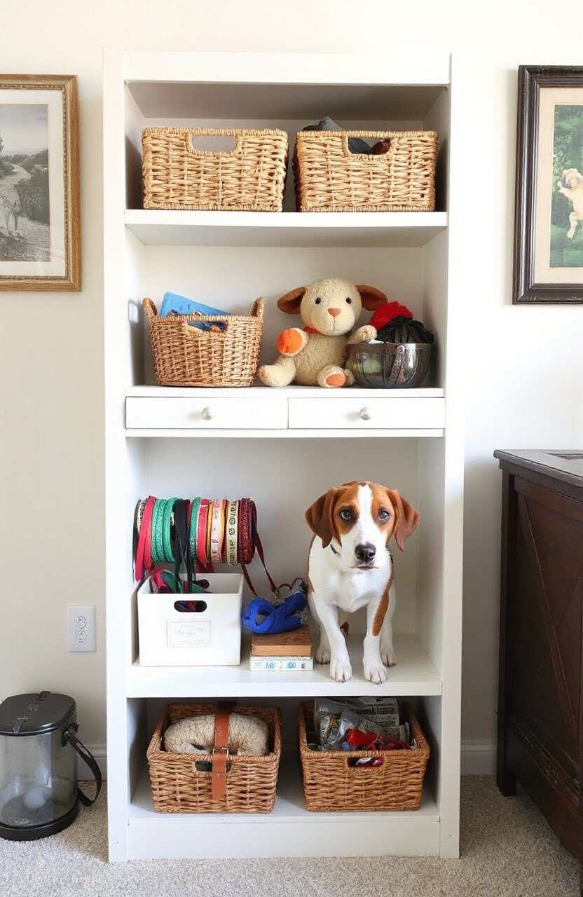 Use baskets or bins on the shelves to organize toys, leashes, and other dog essentials.