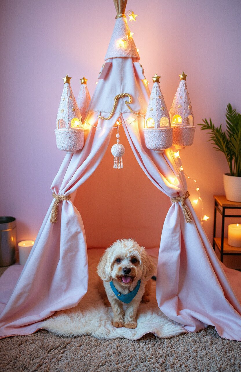 Turn your dog’s space into a magical kingdom with a Fairy Tale Castle Teepee. Adorned with stars, moons, and soft pastel colors, it’s like stepping into a storybook. Your dog will feel like royalty in such an enchanting setting.
