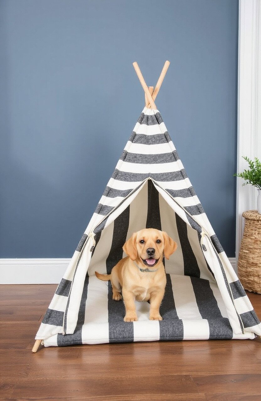 For a touch of sophistication, consider an Elegant Monochrome Teepee. With black and white patterns and sleek lines, it’s a classy choice for chic pups. This teepee is modern elegance at its finest.