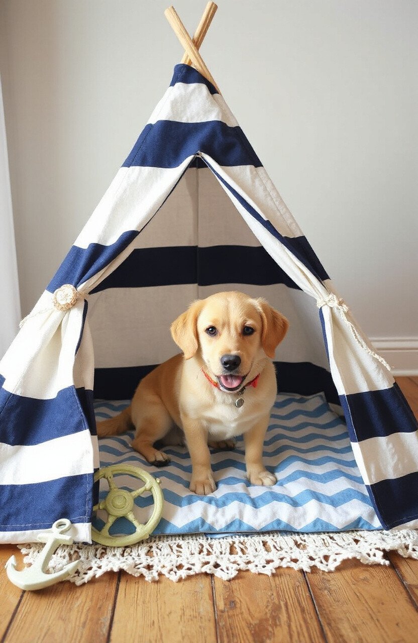 For dogs who dream of the sea, a Nautical Adventure Teepee is an absolute must. With ocean-inspired patterns and colors like navy blue and white, it’s like bringing the beach indoors. Add some decorative anchors and ship wheels to complete the look.