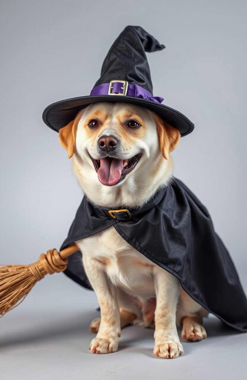 Let your dog join the coven with a witch costume. A pointy hat and a cape will make your pup look magical and mysterious.