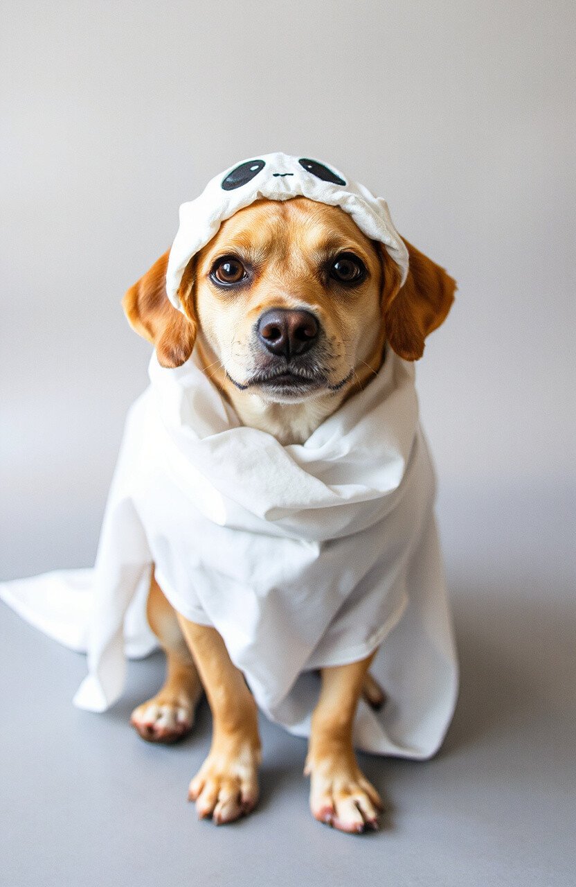 Keep it traditional with a simple ghost costume. A white sheet with eye holes will turn your dog into a spooky specter.