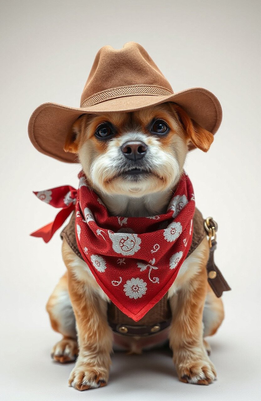 Saddle up for fun with a cowboy costume. A cowboy hat and a bandana will make your dog look ready for the Wild West.
