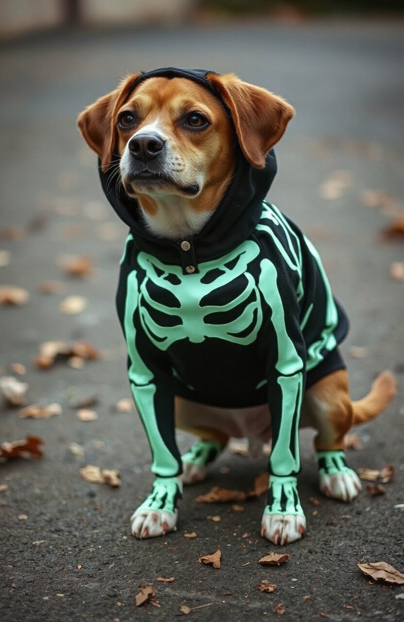 Turn your dog into a walking skeleton with this bone-chilling costume. Glow-in-the-dark bones make this outfit perfect for night outings.